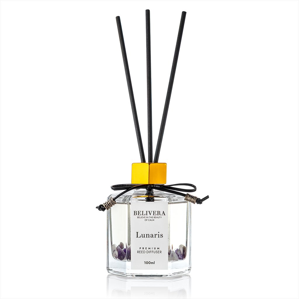 BELIVERA Lunaris Premium Reed Diffuser 100ml – Amethyst Crystal Infused Home Fragrance Scented Oil & Reed Sticks